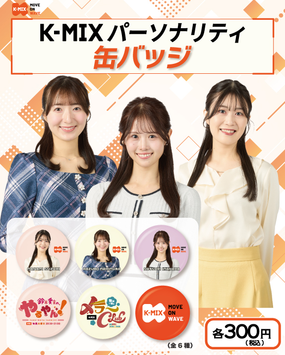 K-MIXオリジナルカプセルトイ 缶バッジシリーズ第3弾「K-MIX パーソナリティ 缶バッジ」が新登場!! K-MIX局パーソナリティ「鈴木愛実」、「牧村一穂」、「今中菜月」の3名の缶バッジに加え…