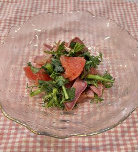 【 グレープフルーツと春菊、スモークタンのサラダ 】